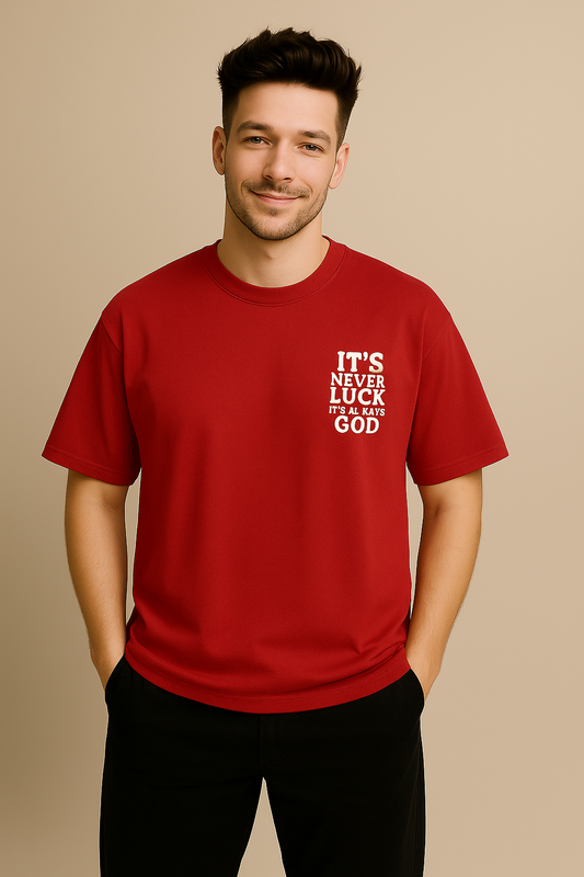 Regular price Rs. 399.00Regular priceUnit price / perRs. 999.00Sale price Rs. 399.00It's Never Luck, It's Always God" Oversized Red T-Shirt